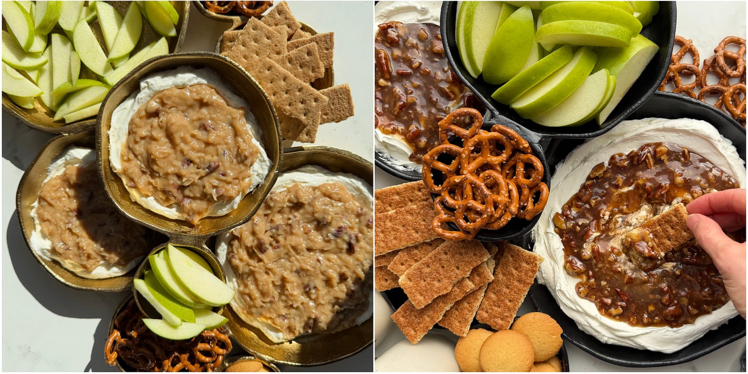 I’m normally a pumpkin-or-triple-berry girl, but my dad is a pecan pie person through and through. So I made a cheesecake base, topped it with gooey pecan pie topping, and now… I think I’m a pecan pie person, too. This dip is insane. Serve with cinnamon grahams, Nilla Wafers, pretzels, or tart apples. Here’s the recipe!